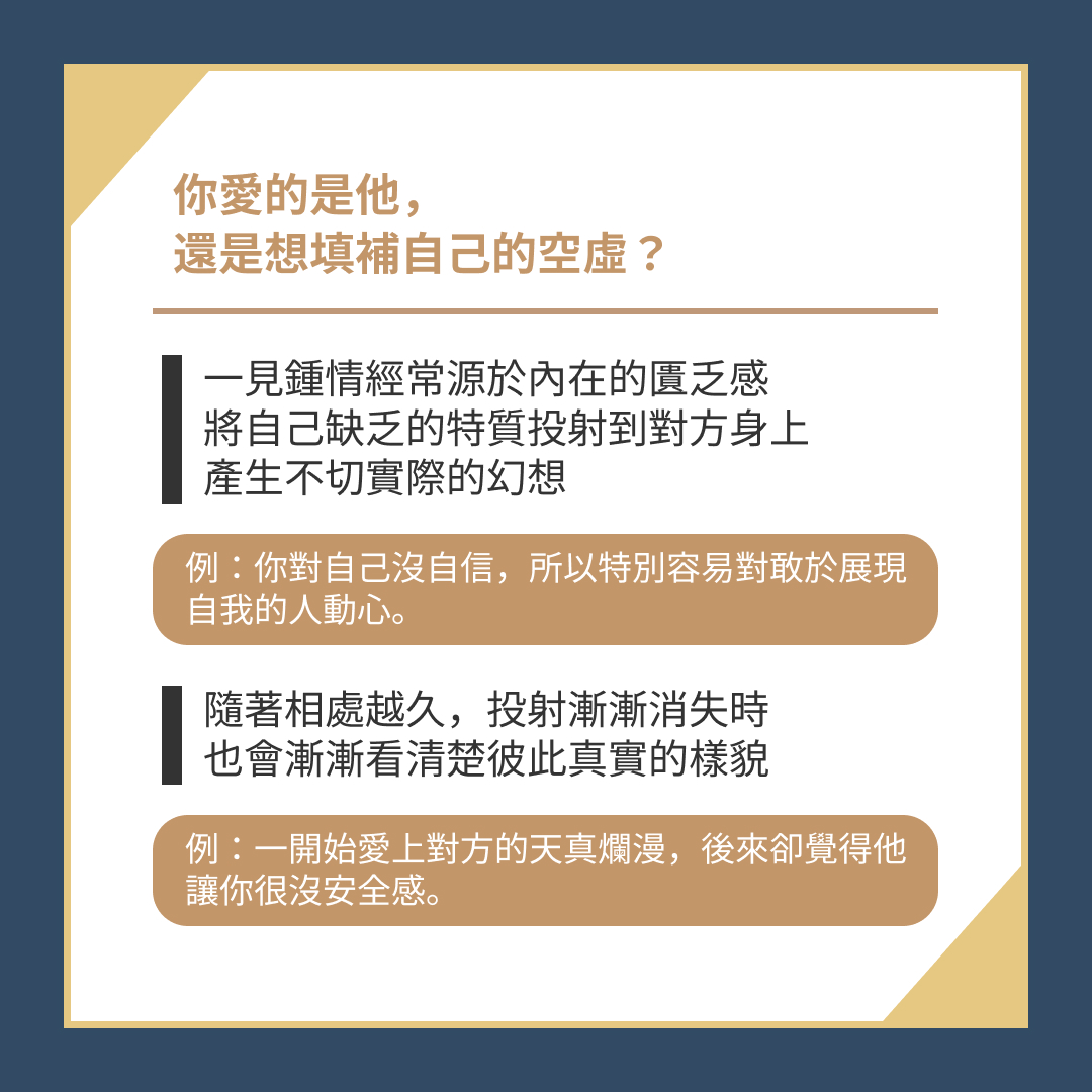 一見鍾情經常源於內在的匱乏感,將自己缺乏的特質投射到對方身上,產生不切實際的幻想