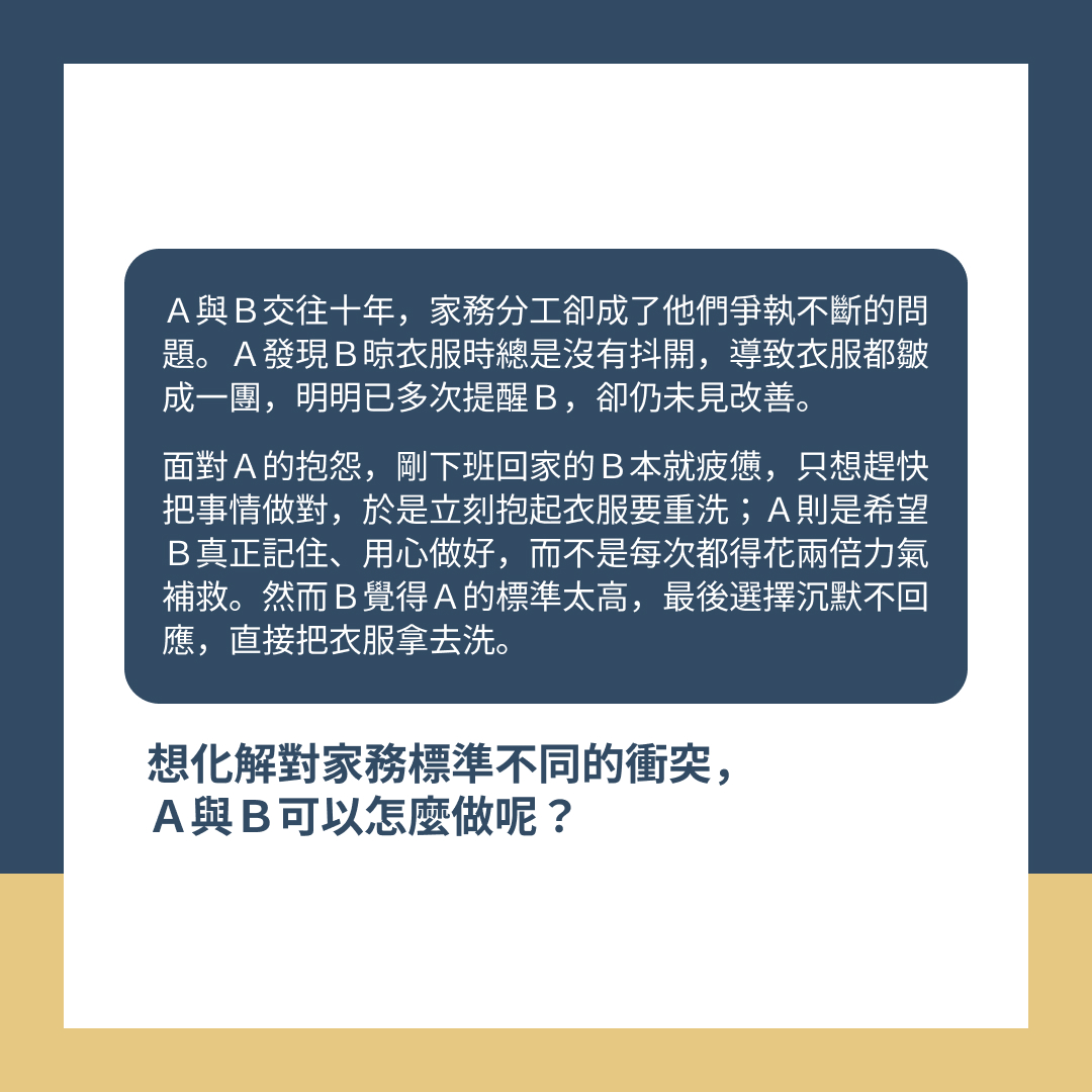 → 當B能夠袒露自己的限制與脆弱,不再是一直悶著頭做事,而A也能理解他並非想推卸責任,內心對晾衣服的標準或許就有調整的空間,雙方就有空間可以一起想解決方法(強化愛的容器)。