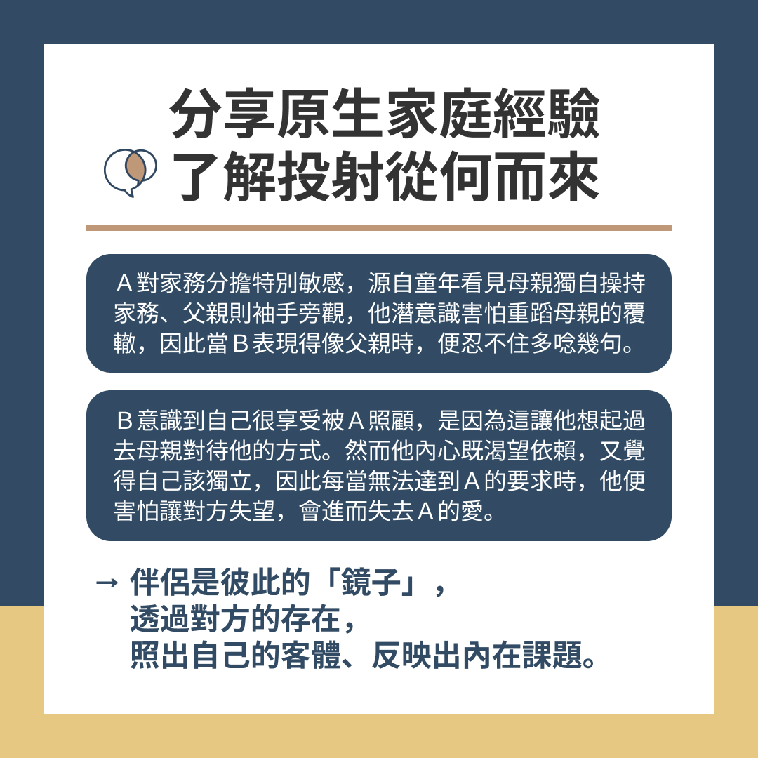 在談原生家庭的故事時,A發現自己對家務分擔特別敏感,源自童年看見母親獨自操持家務,而父親袖手旁觀。他潛意識害怕重蹈母親的覆轍,因此當B表現得像父親時,便忍不住多唸幾句。