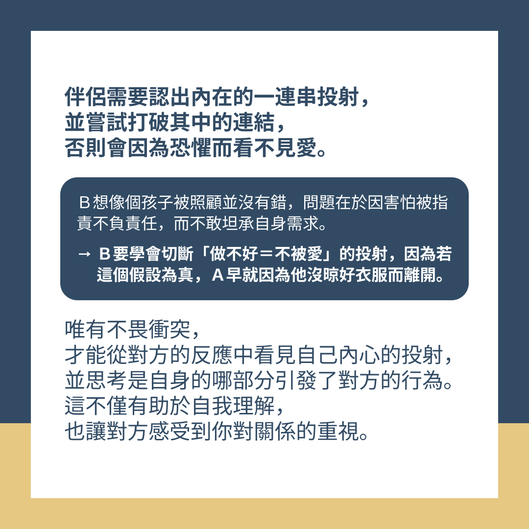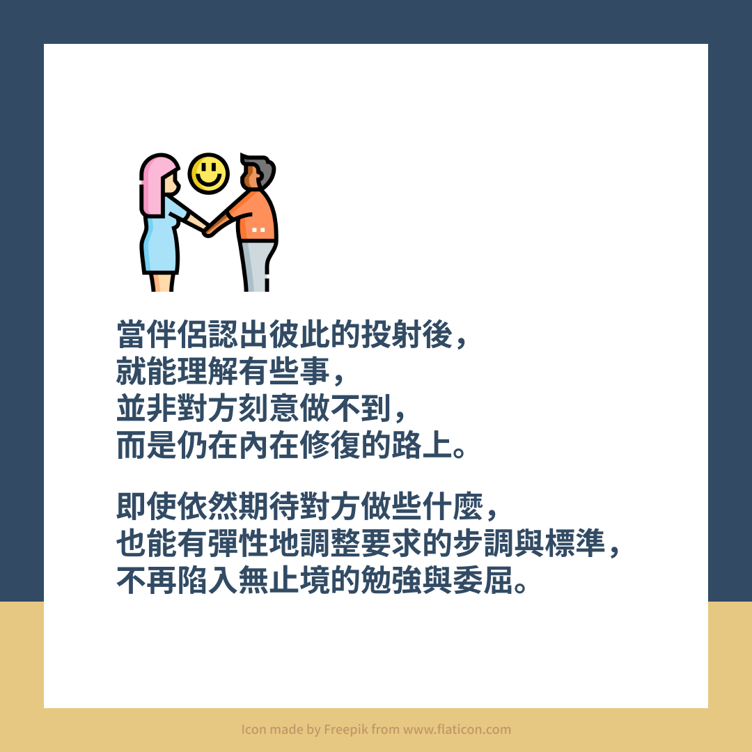 當你們認出彼此的投射後,就能理解有些事並非對方刻意做不到,而是仍在內在修復的路上。即使依然期待對方做些什麼,也能有彈性地調整要求的步調與標準,不再陷入無止境的勉強與委屈中。