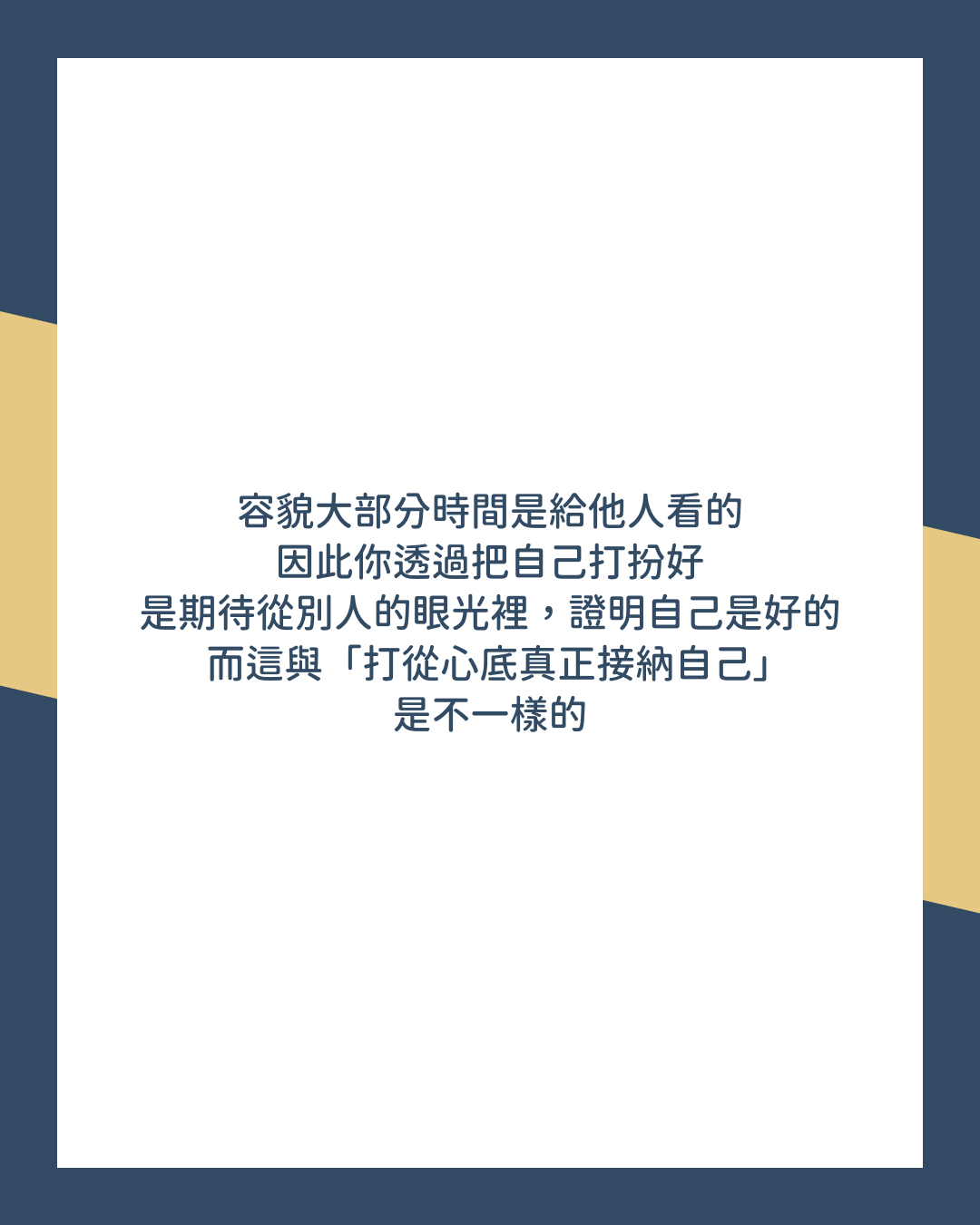 容貌大部分時間是給他人看的,因此你透過把自己打扮好,是期待從別人的眼光裡,證明自己是好的,而這與「打從心底真正接納自己」是不一樣的