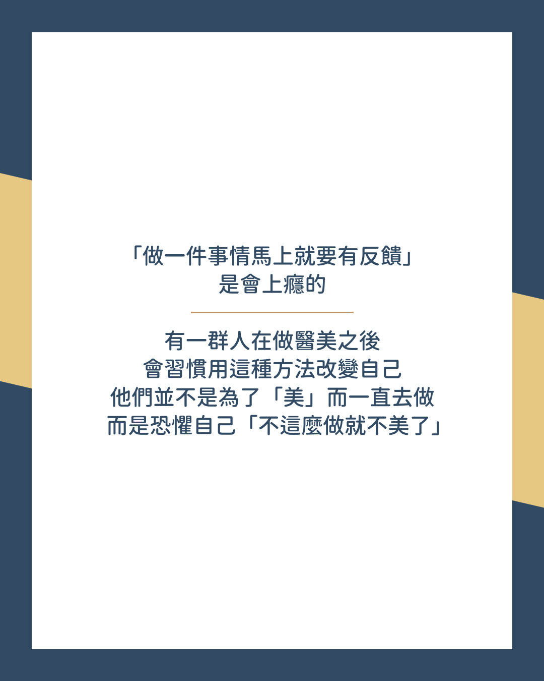 「做一件事情馬上就要有反饋」是會上癮的,有一群人在動刀之後,會習慣用這種方法改變自己,他們不是為了「美」而一直去做,而是恐懼自己「不這麼做就不美了」