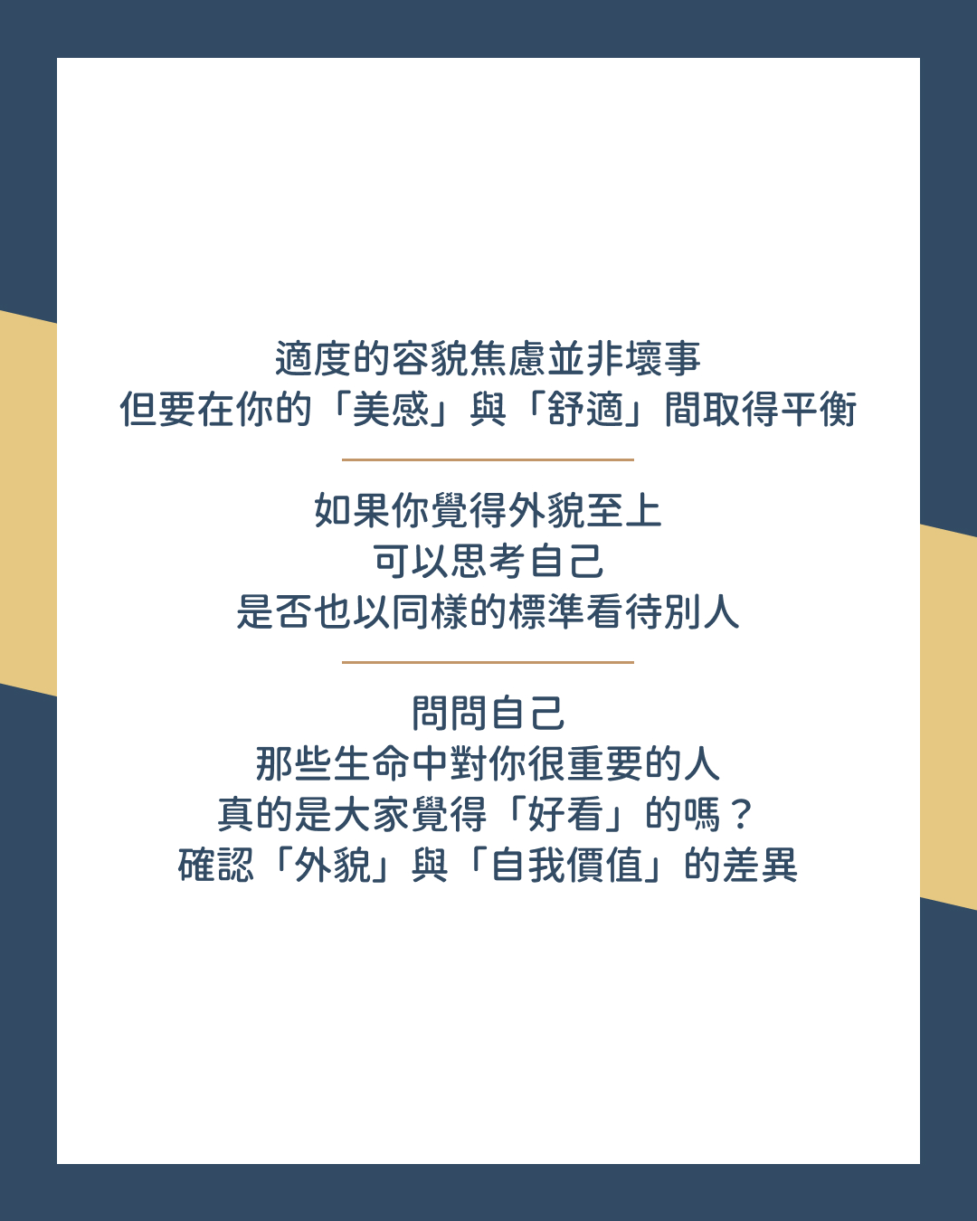 如果你覺得外貌至上,可以思考自己是否也以同樣的標準看待別人,問問自己:那些生命中對你很重要的人,真的是大家覺得「好看」的嗎?確認「外貌」與「自我價值」的差異。