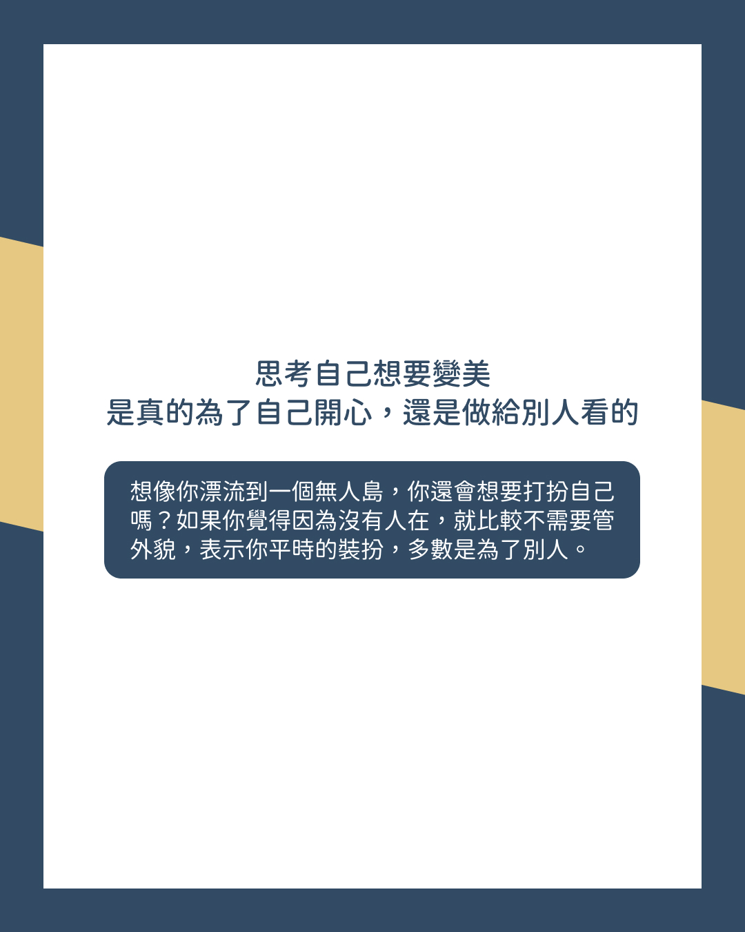 → 如果沒有去思考,美的標準是從何而來,你認為的「做自己」、「愛自己」,可能是不合理的標準,甚至隨時可能會變動。