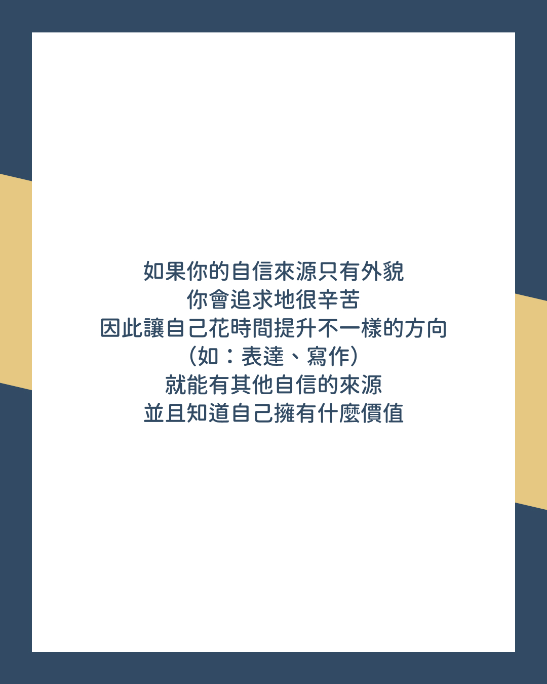 如果你的自信來源只有外貌,你會追求地很辛苦,因此讓自己花時間提升不一樣的方向(如:表達、寫作),就能有其他自信的來源,並且知道自己擁有什麼價值