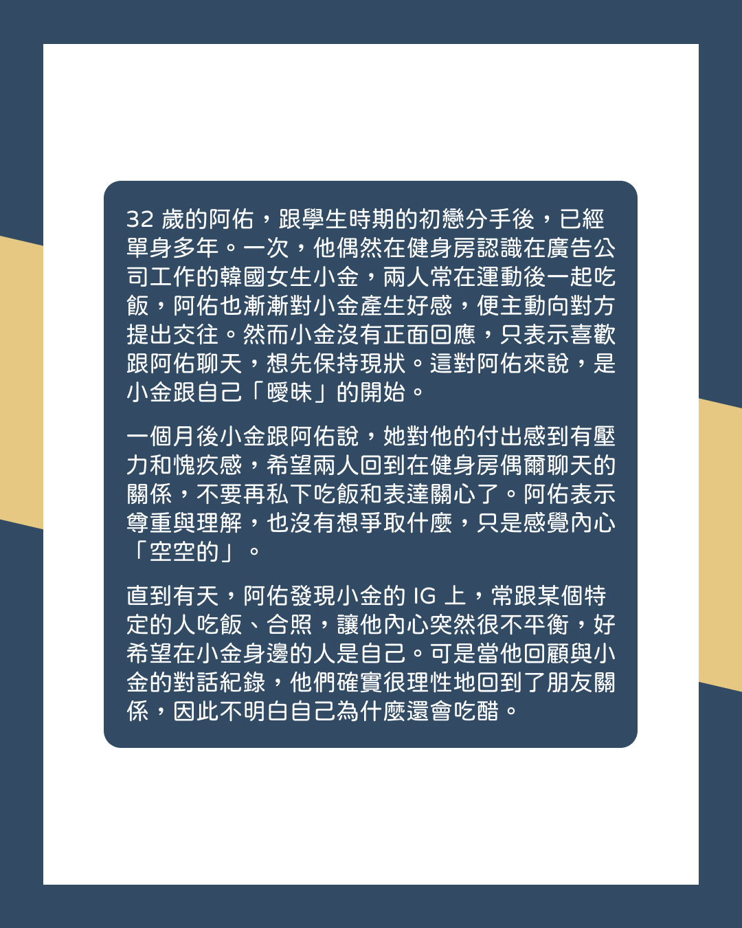 可是當他回顧自己與小金的對話紀錄,就像是在讀一段已經結束的故事一樣。小金不只一次提到自己的工作狀態、表達愧疚,也數度暗示這樣的互動會讓她感到壓力,所以他們是很理性的回到朋友關係。阿佑不明白為什麼自己還會吃醋呢?