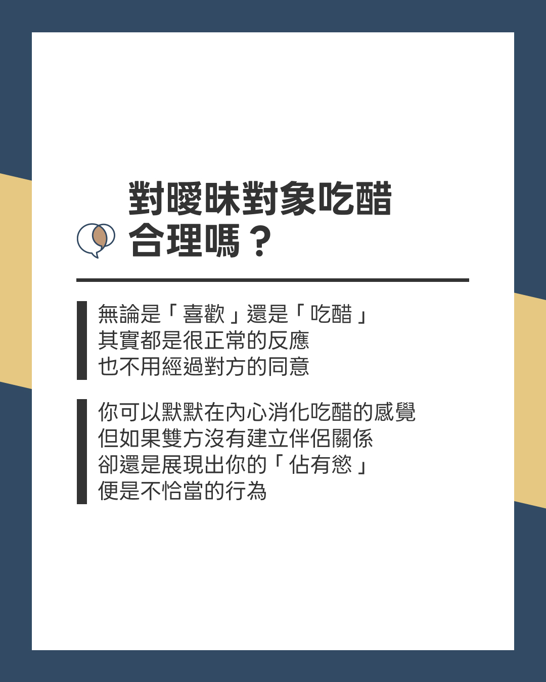 我們可以默默在內心消化這些感覺,但如果是在雙方沒有建立伴侶關係的狀況下吃醋,還展現出「佔有慾」,便是不恰當的行為