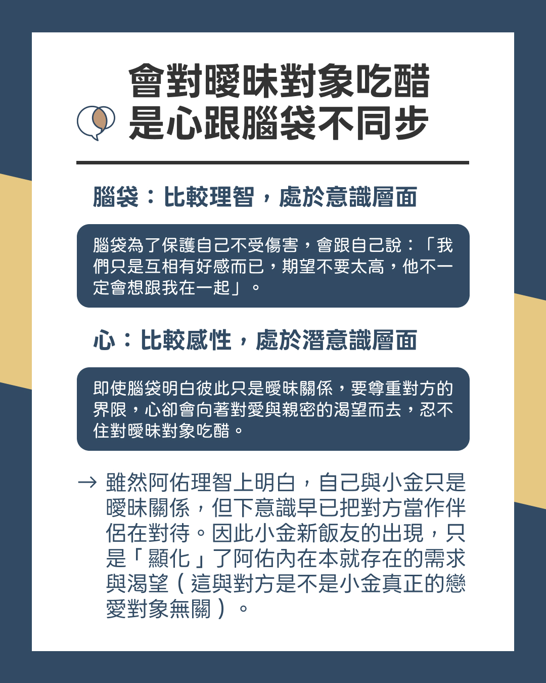 → 雖然阿佑理智上明白,自己與小金只是曖昧關係,但是下意識早已把對方當作伴侶在對待。因此小金新飯友的出現,只是「顯化」了阿佑內在本就存在的需求與渴望(這與對方是不是小金真正的戀愛對象無關)。
