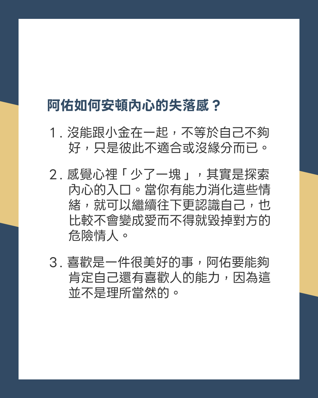 沒有跟小金在一起,不等於自己不好,只是彼此不適合或沒有緣分而已