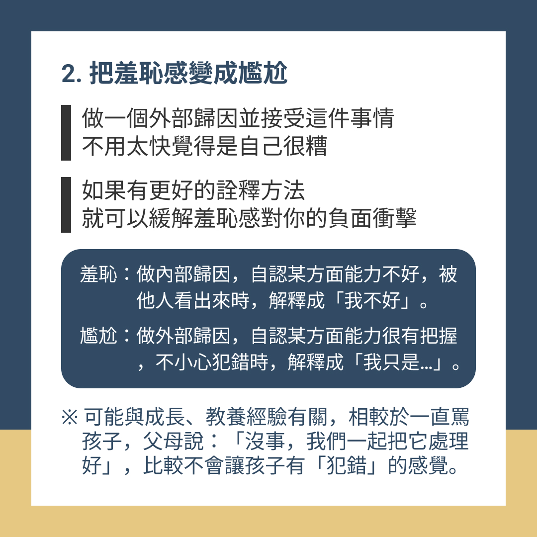 羞恥:做內部歸因,自認自己某方面的能力不好,被他人看出來時,解釋成「我不好」