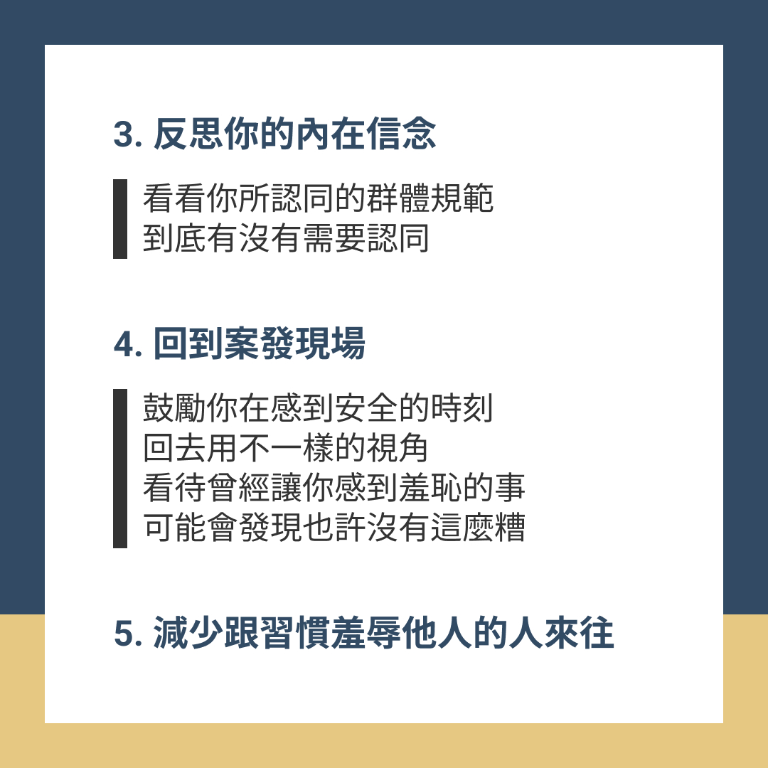 鼓勵你在感到安全的時刻,回去用不一樣的視角,看待曾經讓你感到羞恥的事,可能會發現也許沒有這麼糟