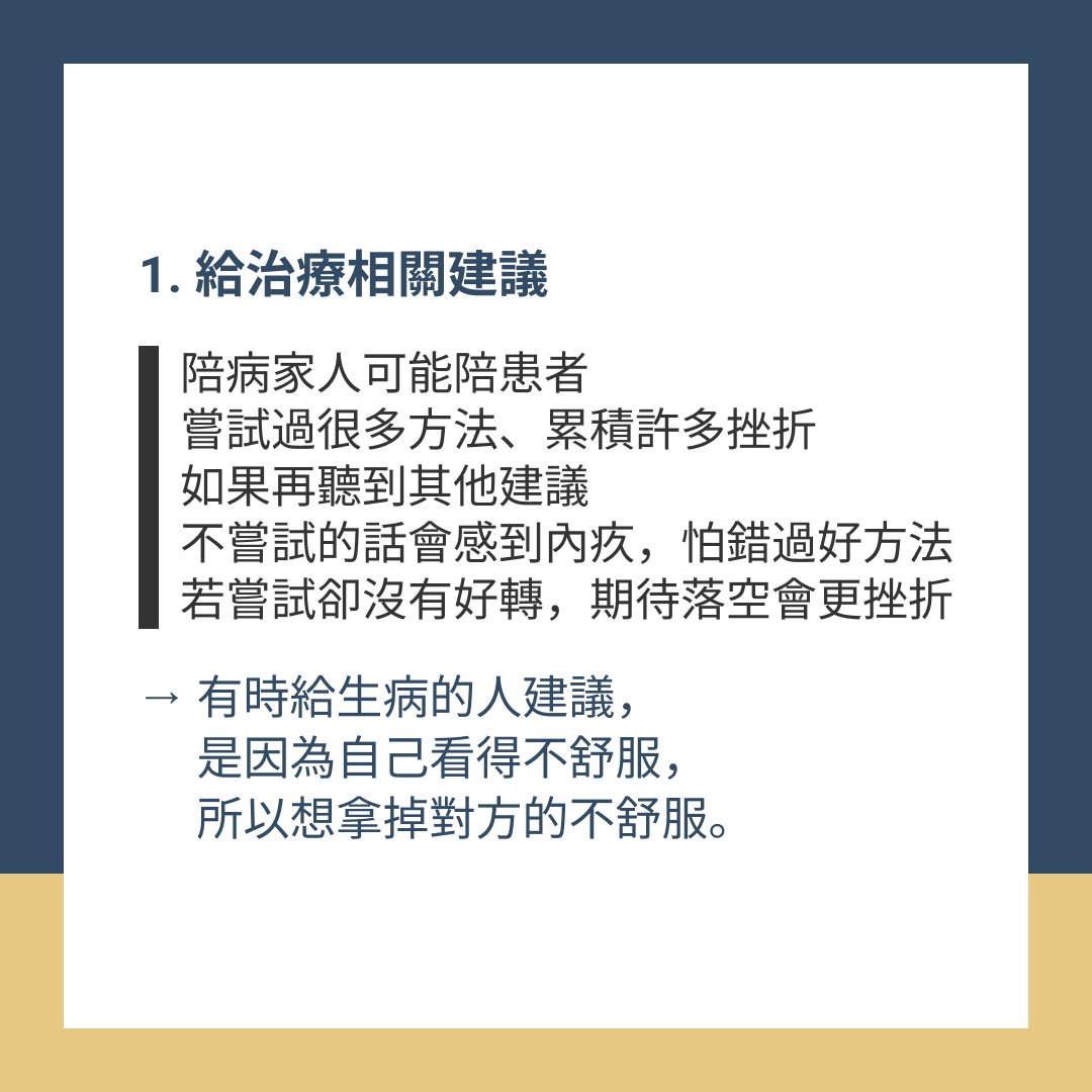 陪病家人可能陪患者嘗試過很多方法、累積許多挫折,如果再聽到其他建議,不嘗試的話會感到內疚,怕錯過好方法;嘗試卻沒有好轉的話,期待落空會更挫折