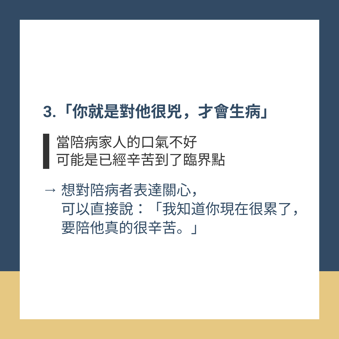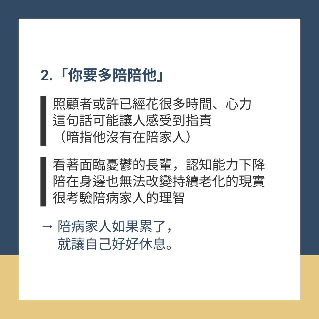 照顧者或許已經花很多時間、心力陪伴患者,這句話可能讓人感受到指責(暗指他沒有在陪伴家人)