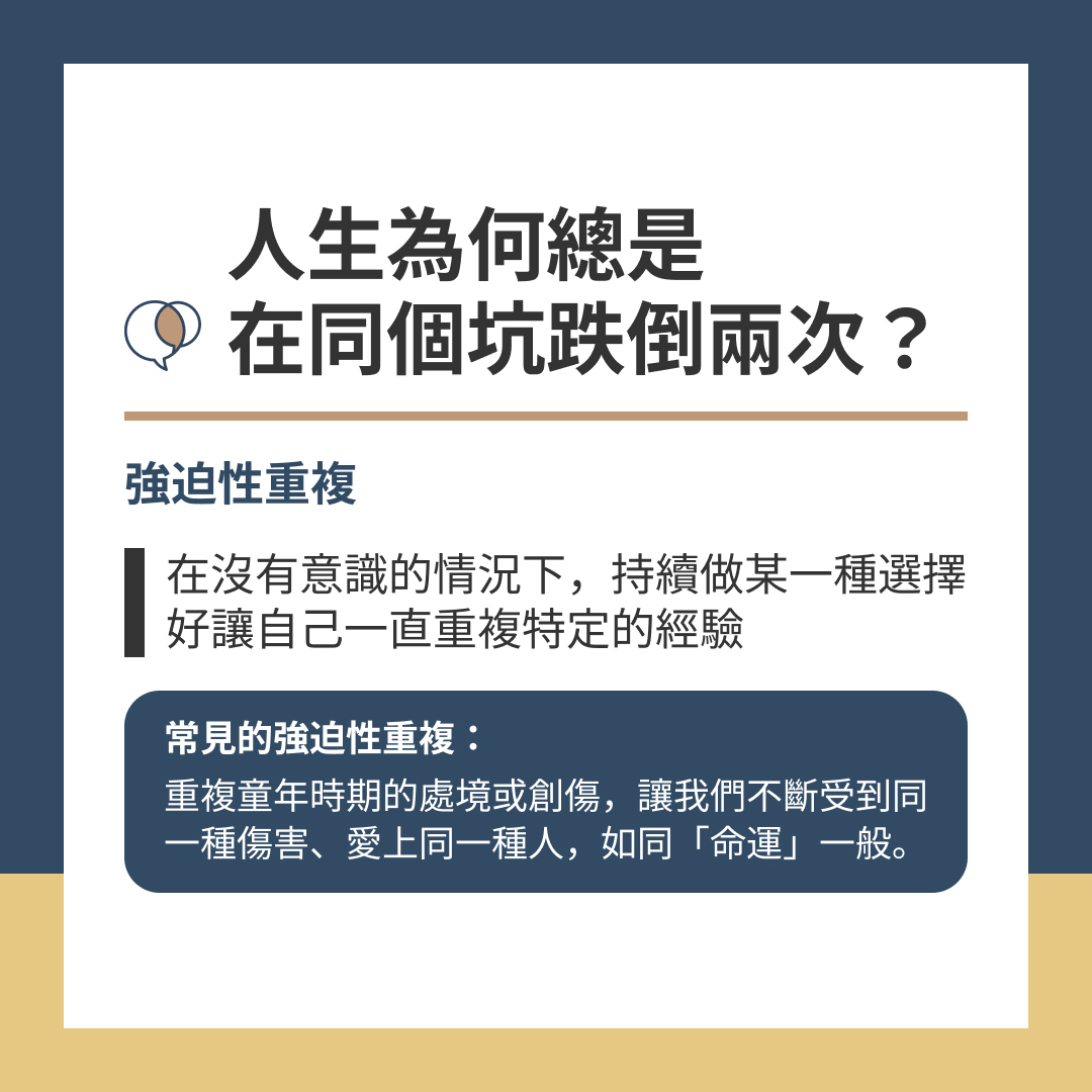 常見的強迫性重複:重複童年時期的處境或創傷,讓我們不斷受到同一種傷害、愛上同一種人,如同「命運」一般。
