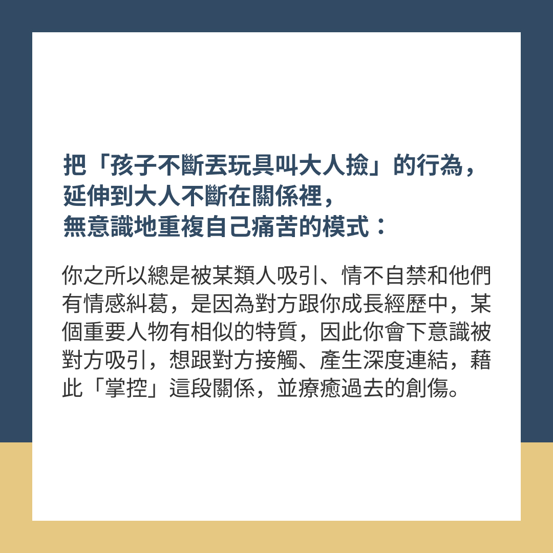 把「小朋友不斷丟玩具叫大人撿」的行為,延伸到大人不斷在關係裡,無意識地重複自己痛苦的模式: