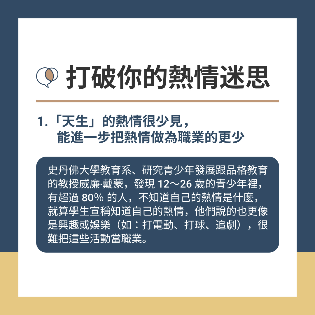 史丹佛大學教育系、研究青少年發展跟品格教育的教授威廉‧戴蒙,發現12歲到26歲的青少年裡,有超過80%的人不知道自己的熱情是什麼,就算學生宣稱知道自己的熱情,他們說的也更像是興趣或娛樂(如:打電動、打球、追劇),很難把這些活動當職業。
