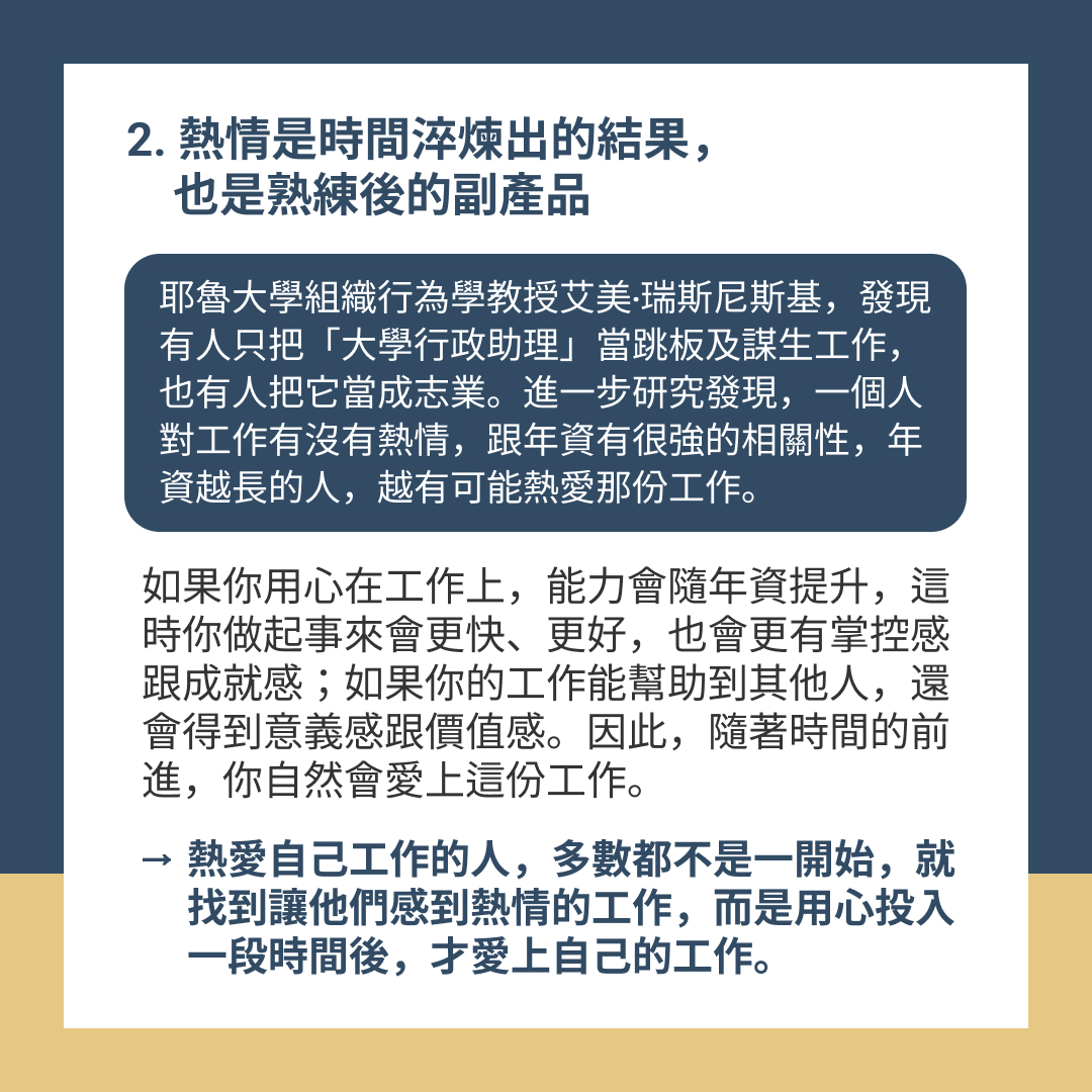 → 熱愛自己工作的人,大多數都不是一開始,就找到讓他們感到熱情的工作,而是用心投入一段時間後,才愛上自己的工作。