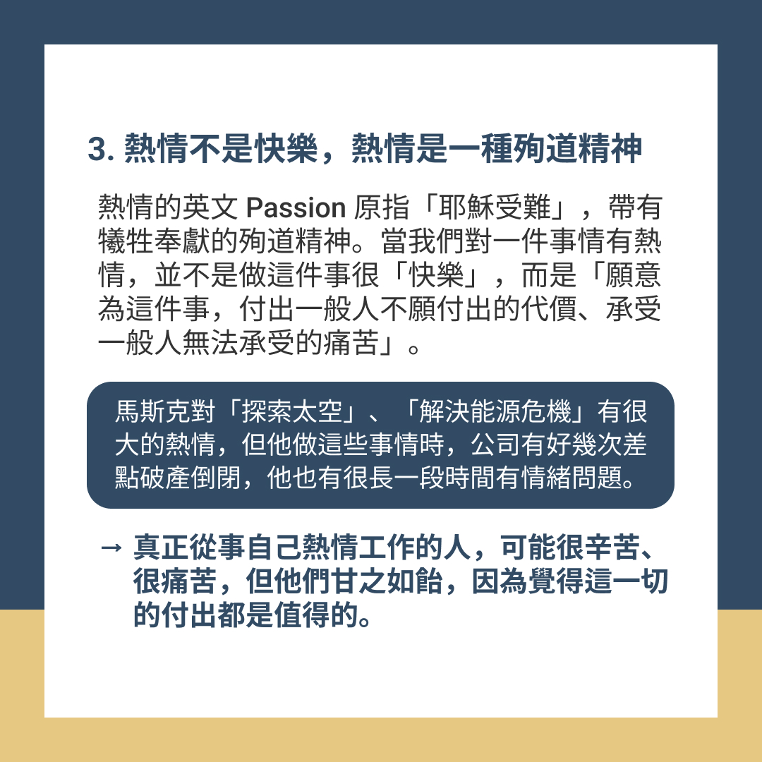 → 真正從事自己熱情工作的人,可能是很辛苦、痛苦的,但他們甘之如飴,因為覺得這一切付出都是值得的。