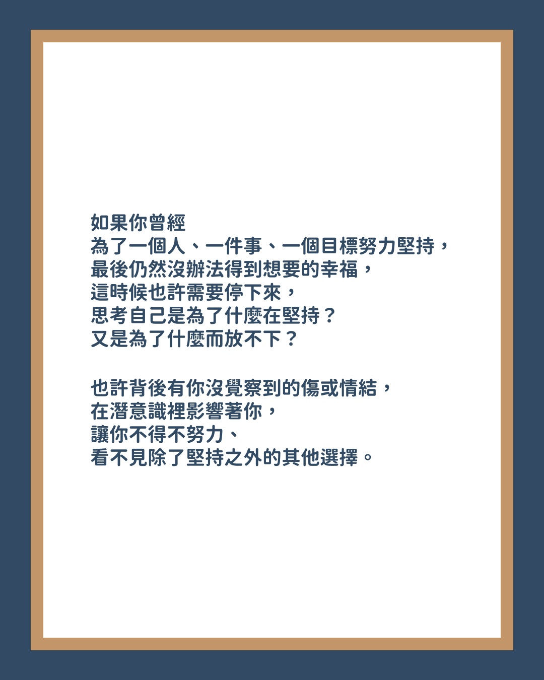 如果你曾經為了一個人、一件事、一個目標努力堅持,最後仍然沒辦法得到想要的幸福,這時候也許需要停下來,思考自己是為了什麼在堅持?又是為了什麼而放不下?也許背後有你沒覺察到的傷或情結,在潛意識裡影響著你,讓你不得不努力、看不見除了堅持之外的其他選擇。