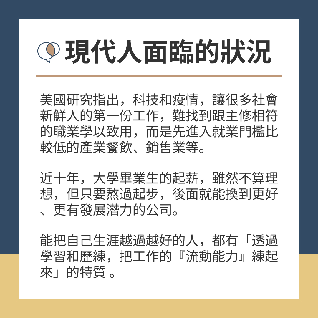 美國研究指出:科技和疫情,讓很多社會新鮮人的第一份工作,很難學以致用、找到跟大學主修相符的職業,而是先進入就業門檻比較低的產業(如:餐飲業、銷售業)