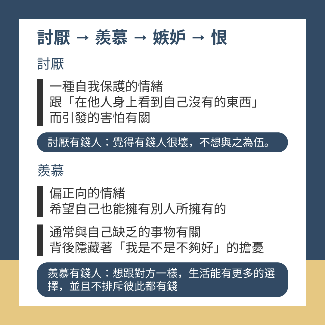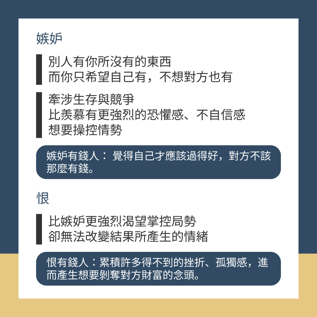 例:「嫉妒有錢人」→ 覺得自己才應該過得好,而對方不該那麼有錢。
