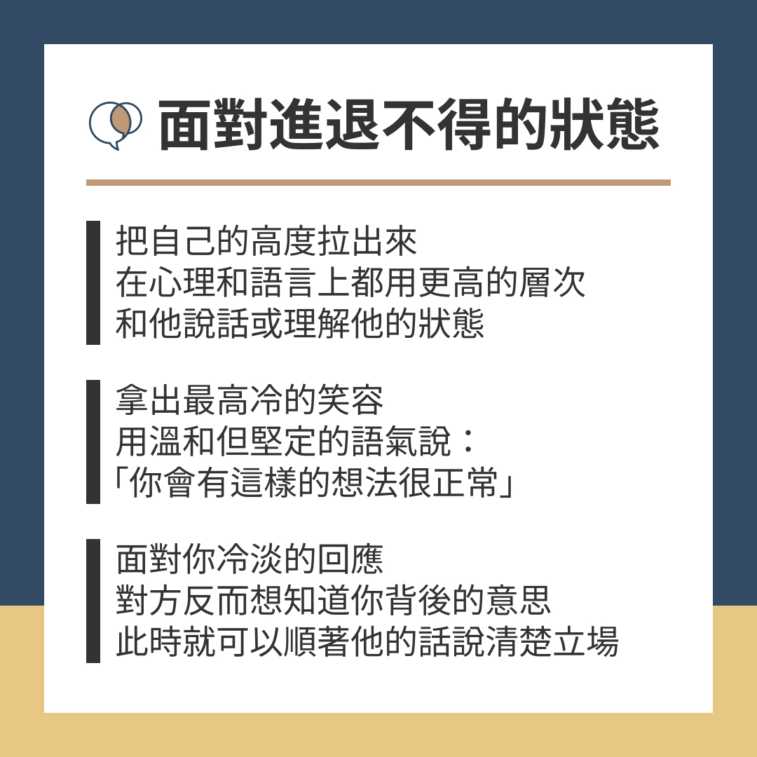 拿出最高冷的笑容,用溫和但堅定的語氣說:「你會有這樣的想法很正常」