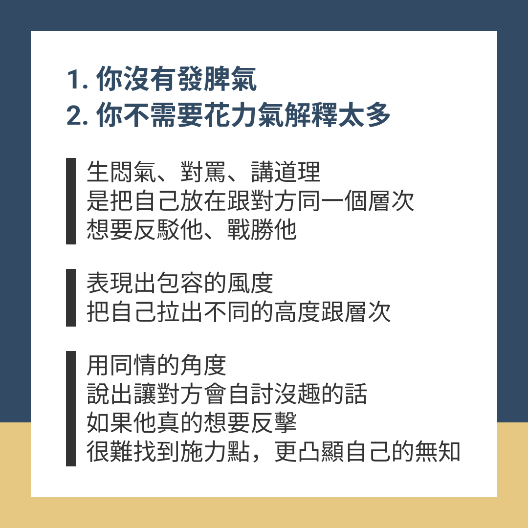 如果你保持冷靜,且說了一篇大道理,他們還是會覺得,你因為很在意這件事,才會花這麼多力氣解釋一堆