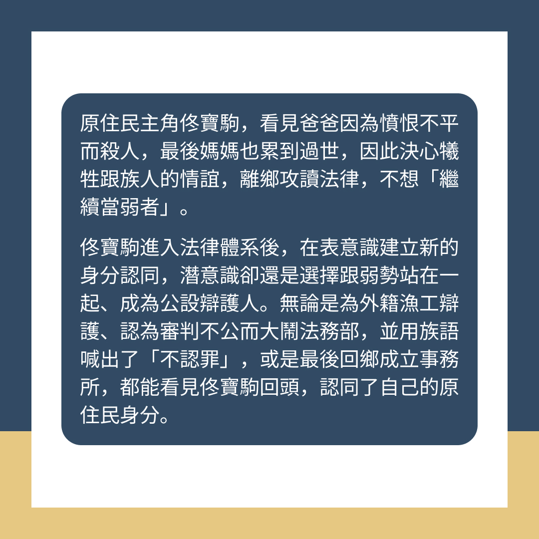 佟寶駒進入法律體系後,在表意識建立新的身分認同,潛意識卻還是選擇跟弱勢站在一起、成為公設辯護人。佟寶駒無論是為外籍漁工辯護、認為審判不公而大鬧法務部,並用族語喊出了「不認罪」,或是最後回鄉成立事務所,都能看見他回頭認同自己的原住民身分。