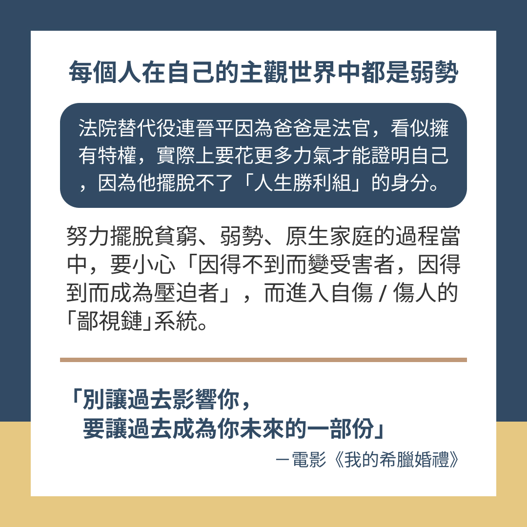 努力擺脫貧窮、弱勢、原生家庭的過程中,要小心「因得不到而變受害者,因得到而成為壓迫者」,進入自傷/傷人的「鄙視鏈」系統