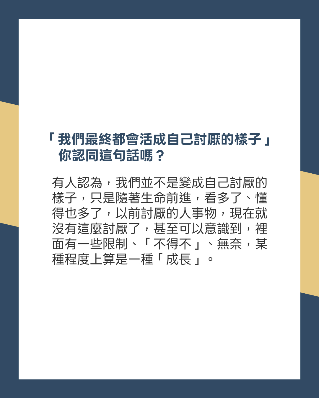 也有人認為,我們並不是變成自己討厭的樣子,只是隨著生命的前進,看得多了、懂得也多了,以前討厭的人事物,現在就也沒有這麼討厭了,甚至可以意識到,裡面有一些限制、「不得不」、無奈,某種程度上算是一種「成長」。