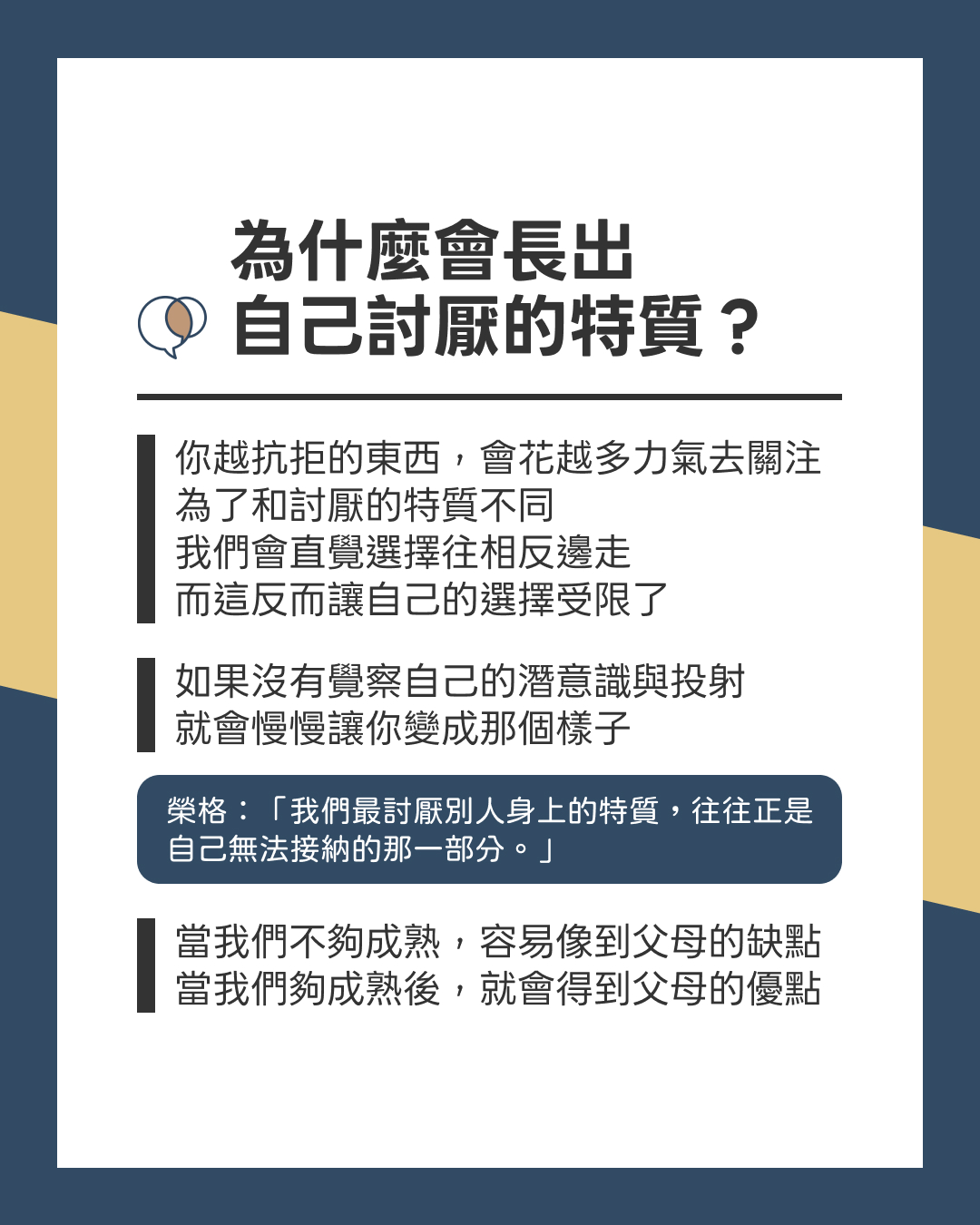 榮格:「我們最討厭別人身上的特質,往往正是自己無法接納的那一部分。」如果沒有覺察自己的潛意識與投射,就會慢慢讓你變成那個樣子