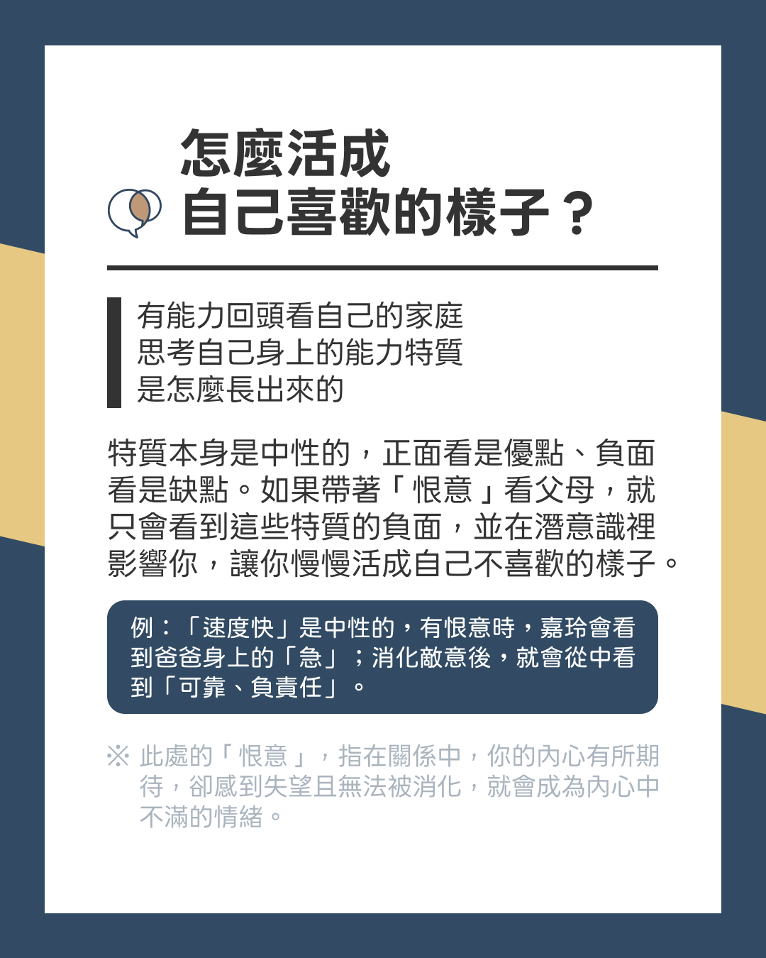特質本身是中性的,正面看是優點,負面看是缺點。如果帶著「恨意」去看父母,就只會看到這些特質的負面,並在潛意識裡影響你,讓你慢慢活成自己不喜歡的樣子。