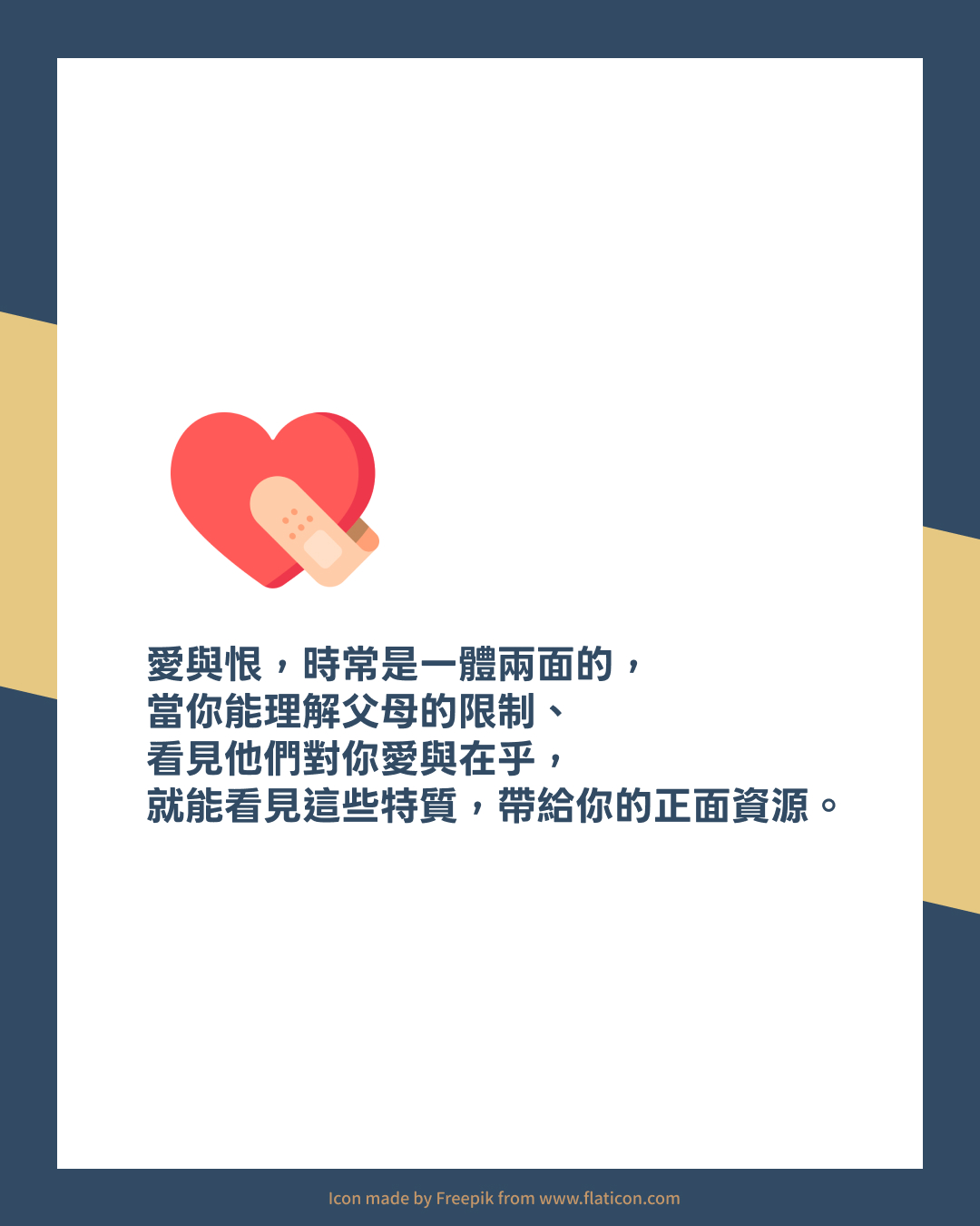 → 愛跟恨時常是一體兩面的,當你能理解父母親的限制、看見他們對你愛與在乎,就能看見這些特質帶給你的正面資源。
