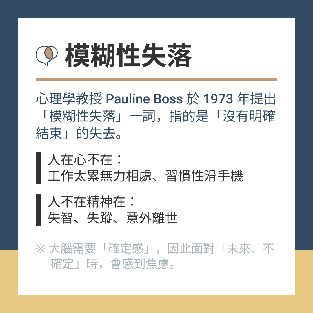 → 心理學教授 Pauline Boss於1973年提出「模糊性失落」一詞,指的是「沒有明確結束」的失去。