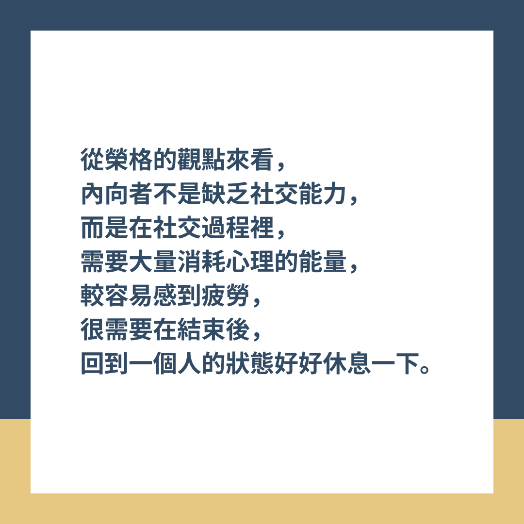 從榮格的觀點來看,內向者不是缺乏社交能力,而是在社交過程裡,需要大量消耗心理的能量,較容易感到疲勞,很需要在結束後,回到一個人的狀態好好休息一下。