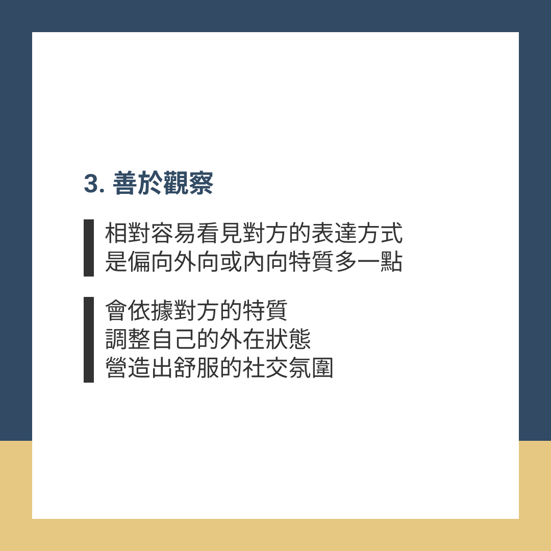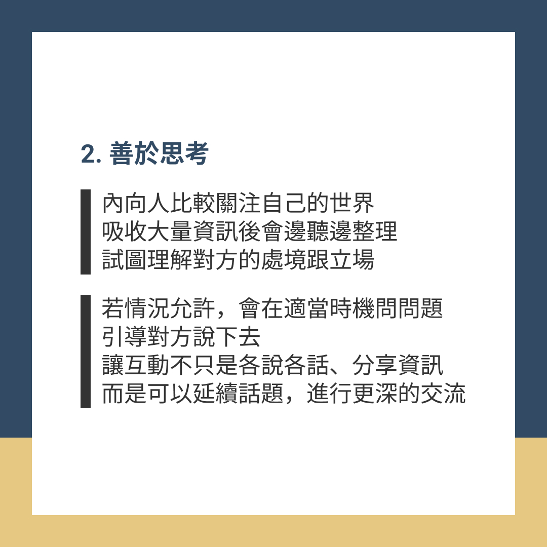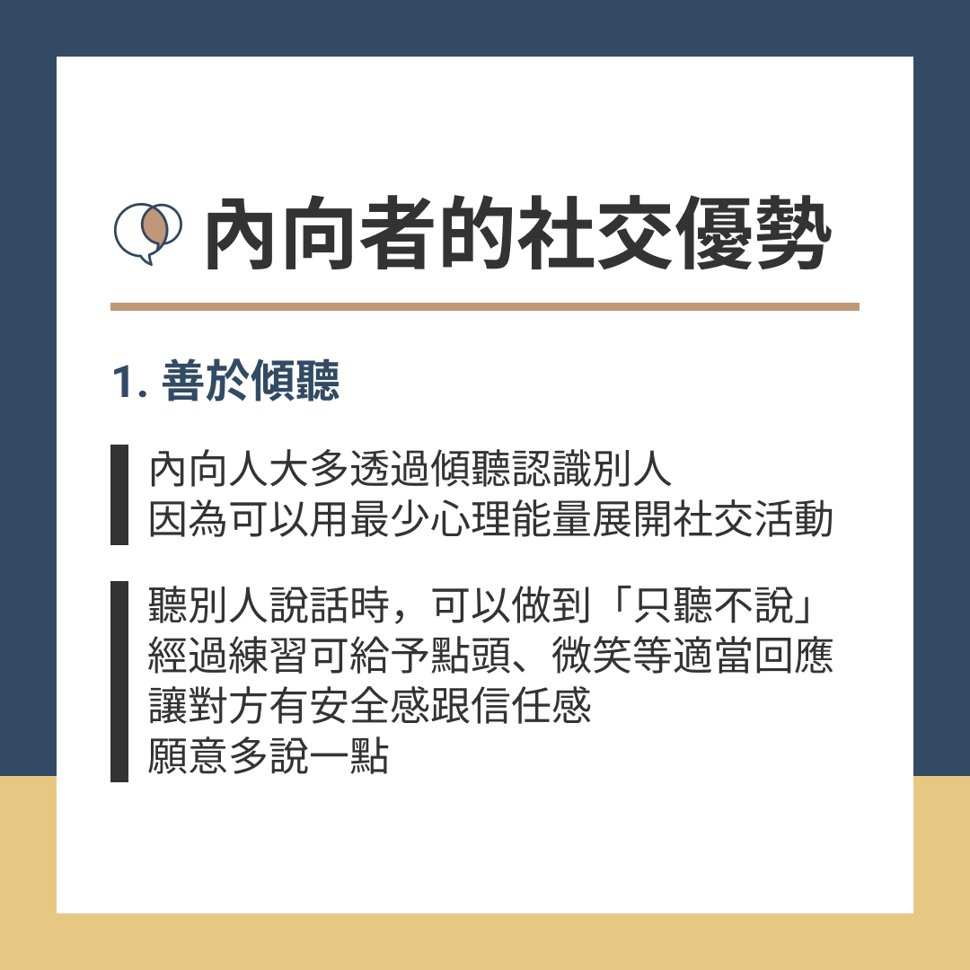 ※ 並非要內向人變得外向,或是矯正自己的內向特質,而是當你能夠坦然面對自我,並知道自己的優勢,就可以透過更多技巧,把優勢發揮好。