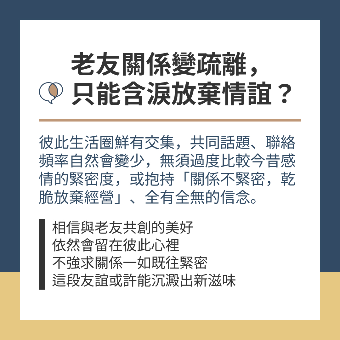相信與老友共創的美好,依然會留在彼此心裡,不強求關係一如既往緊密,這段友誼或許能沉澱出新滋味