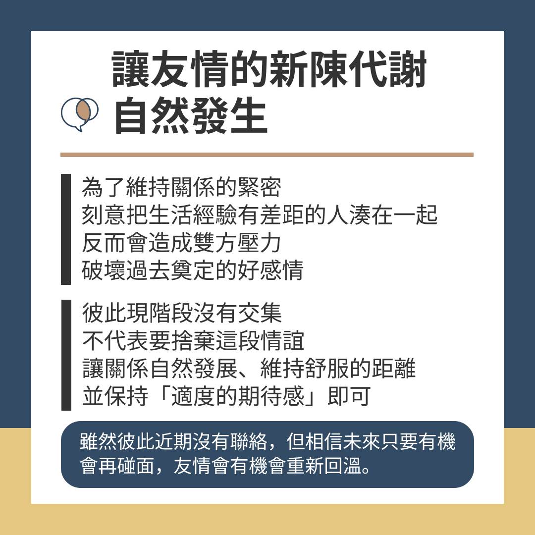 當我們進到新的環境、人生階段(如:畢業、出社會),形成新的朋友圈,卻也跟過去好友也漸行漸遠。
