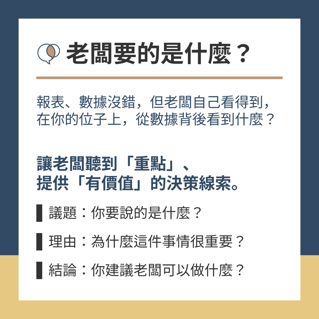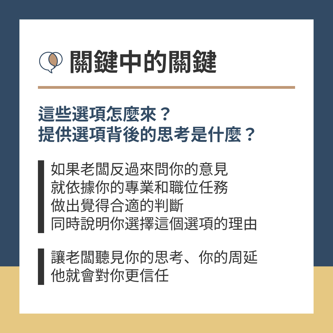 - 換位思考,從老闆的角度出發,蒐集明確的訊息、思考可能方案,再進一步推演每個方案背後的風險和收益,結論才能更到位、更有價值