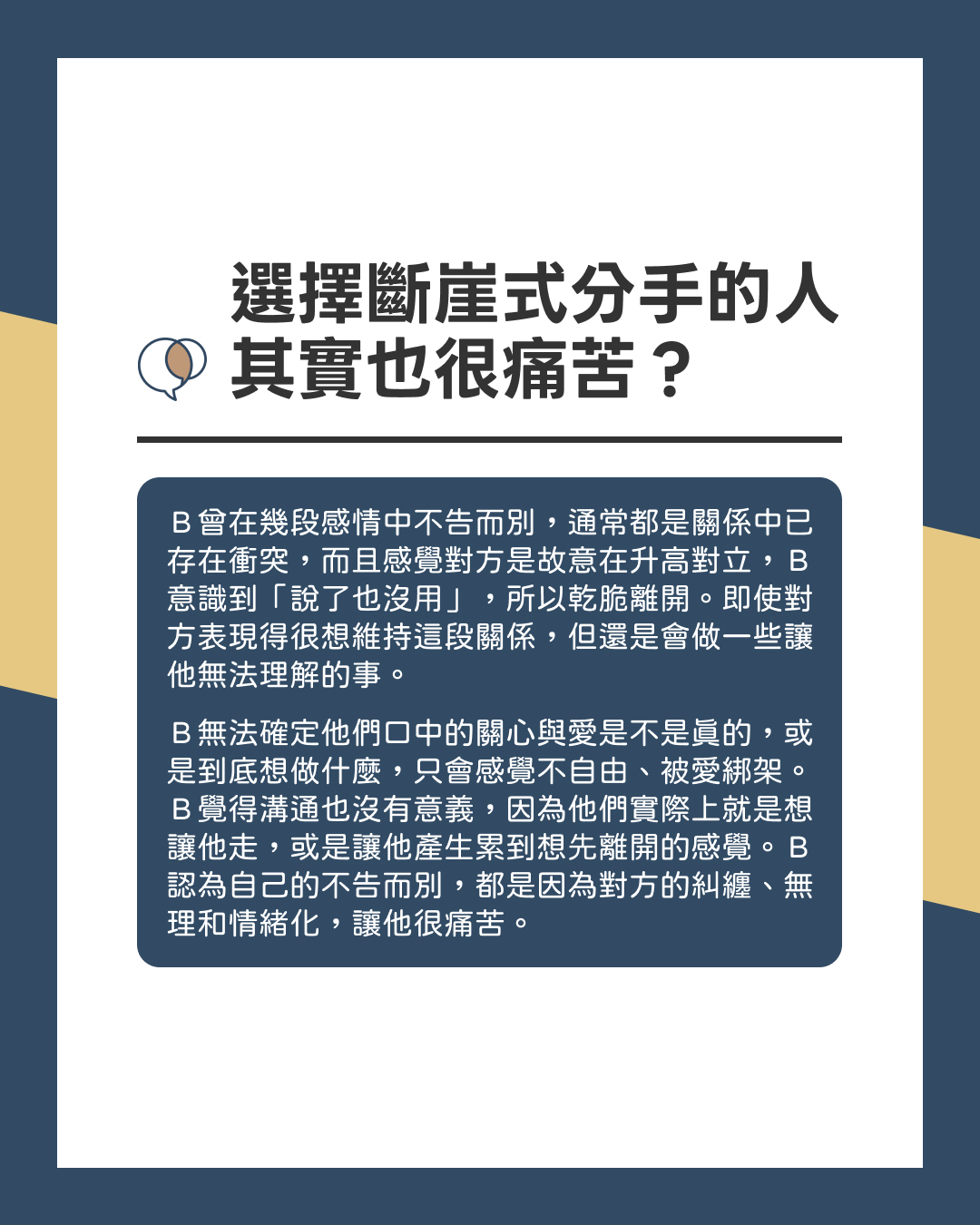 有些伴侶看似不告而別,實際上可能有努力溝通、求助過,甚至早有預告「如果你繼續這樣,我會離開」,便不在今日討論的範圍中。