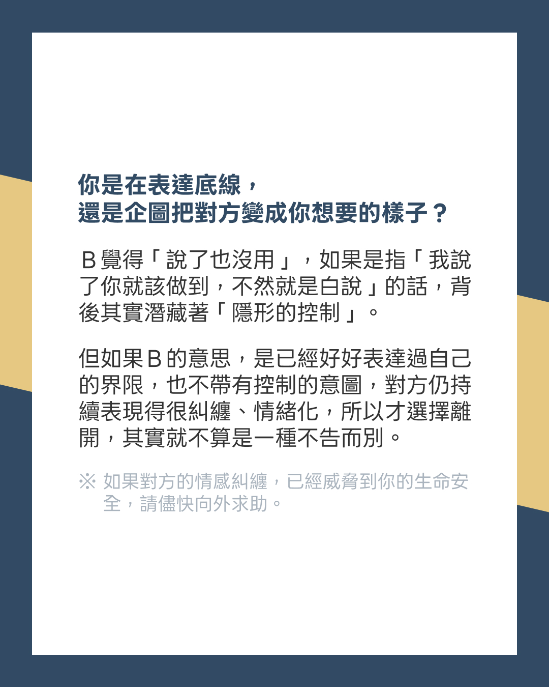 但如果B是指已經好好表達過自己的界限,也不帶有控制的意圖,對方仍持續表現得很糾纏、情緒化,所以才選擇離開,其實就不算是一種不告而別。