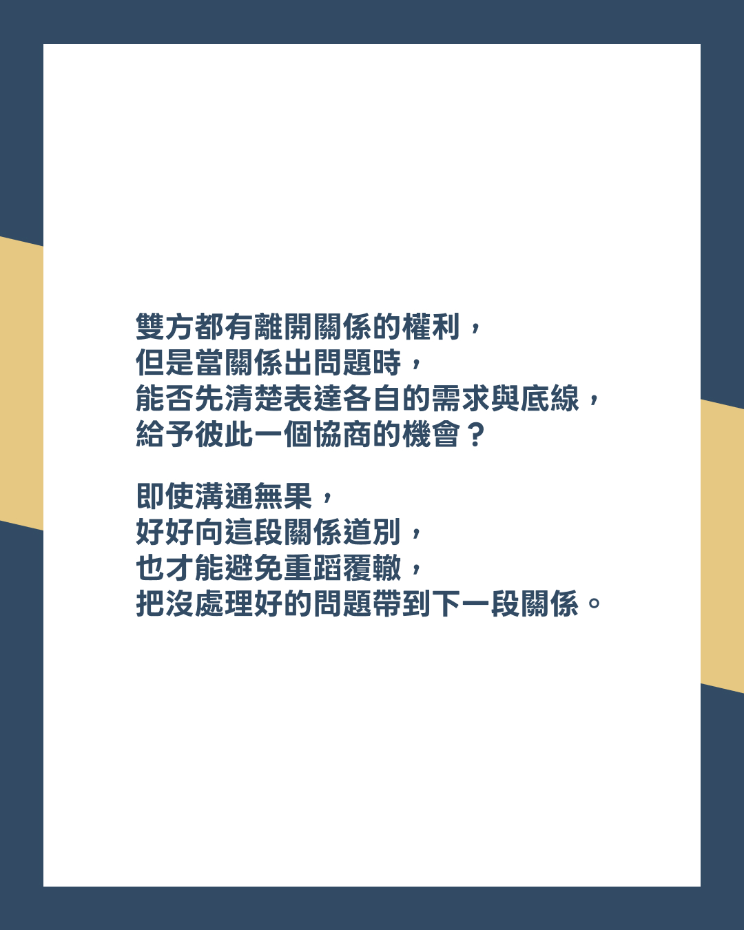 → 雙方都有離開關係的權利,但是當關係出問題時,能否先清楚表達各自的需求與底線,給予彼此一個協商的機會?即使溝通無果,好好向這段關係道別,也才能避免重蹈覆轍,把沒處理好的問題帶到下一段關係。