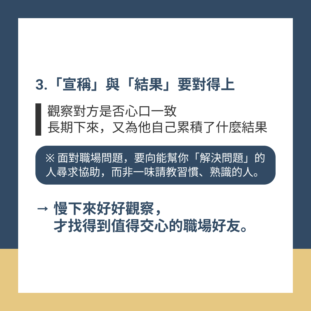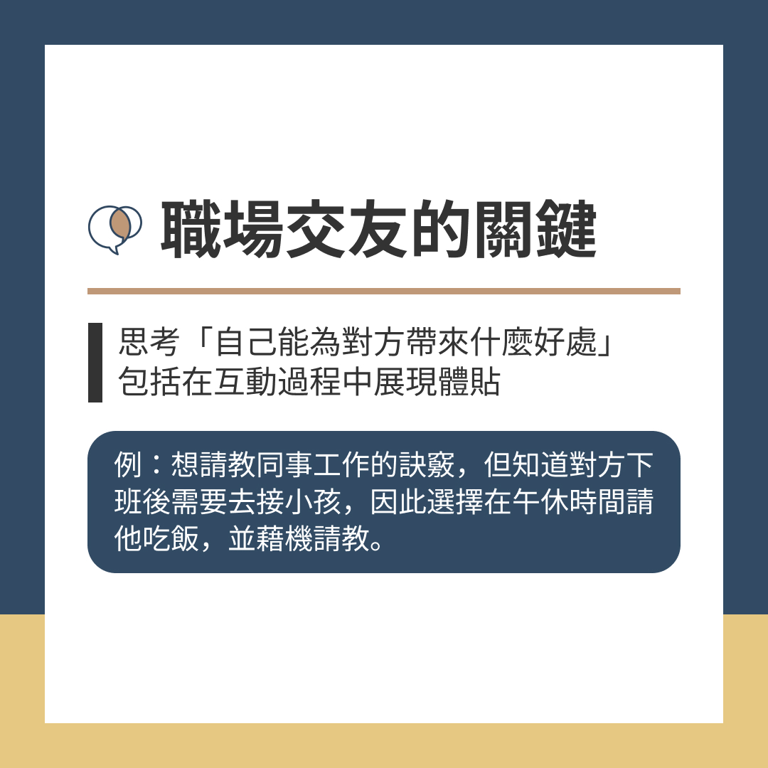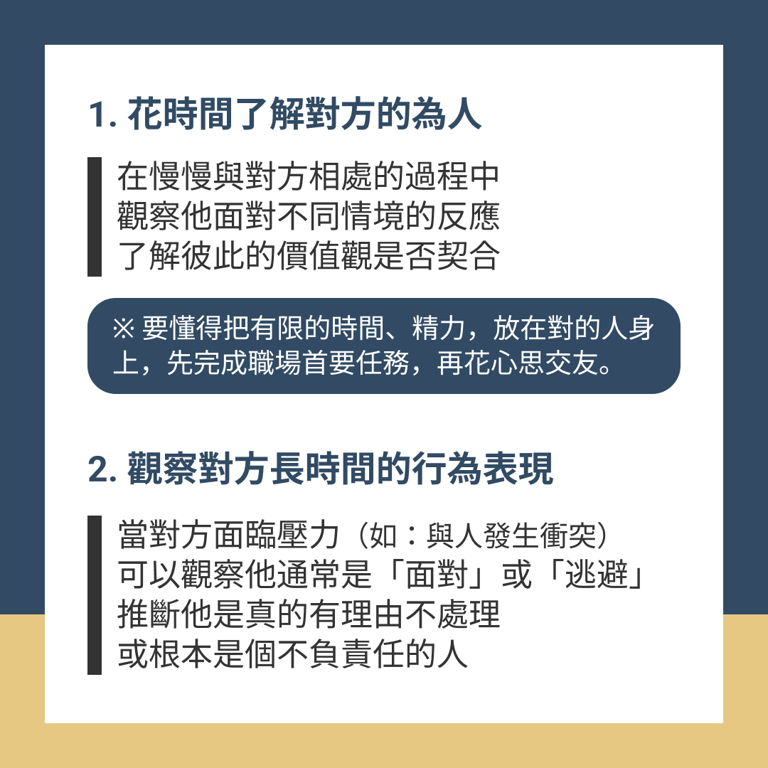 ※ 懂得把有限的時間、精力,放在對的人身上,先完成職場首要任務,再來花心思交友。