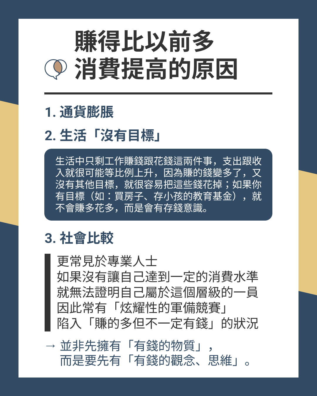 生活中只剩工作賺錢跟花錢這兩件事,支出跟收入就很可能等比例上升,因為賺的錢變多了,又沒有其他目標,就很容易把這些錢花掉;如果你有一些目標(如:買房子、存小孩的教育基金),就不會賺多花多,而是會有存錢意識。