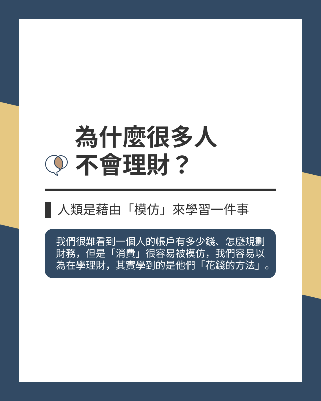 我們很難看到一個人的帳戶有多少錢、怎麼規劃財務,但是「消費」很容易被模仿,我們容易以為在學理財,其實學到的是他們「花錢的方法」。