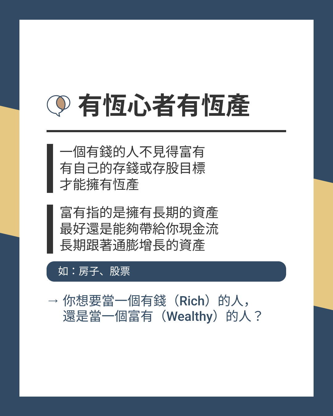 一個有錢的人不見得富有,有自己的存錢或存股目標,才能擁有恆產