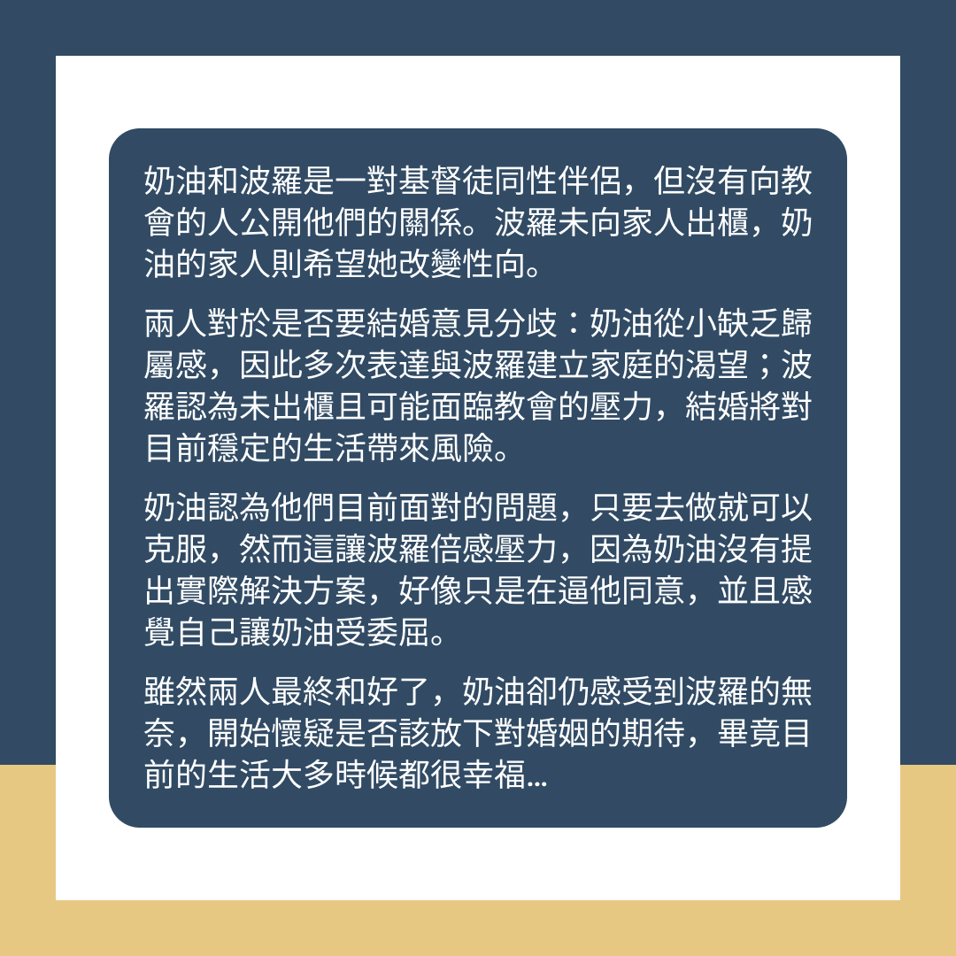 某次看完電影後,奶油感動地向波羅提出結婚的想法,波羅表示彼此已經聊過多次,雖然了解奶油的心願,但由於奶油尚未提出有效的解決方案,甚至尚未向父母出櫃,加上可能面臨教會輿論壓力,結婚將會對他們目前穩定、滿意的生活帶來風險。