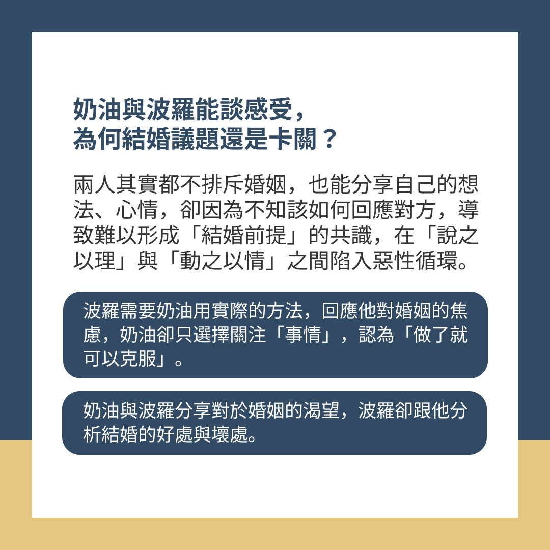 兩人其實都不排斥婚姻,也能分享自己的想法、心情,卻因為不知該如何回應對方,導致難以形成「結婚前提」的共識,在「說之以理」與「動之以情」間陷入惡性循環。