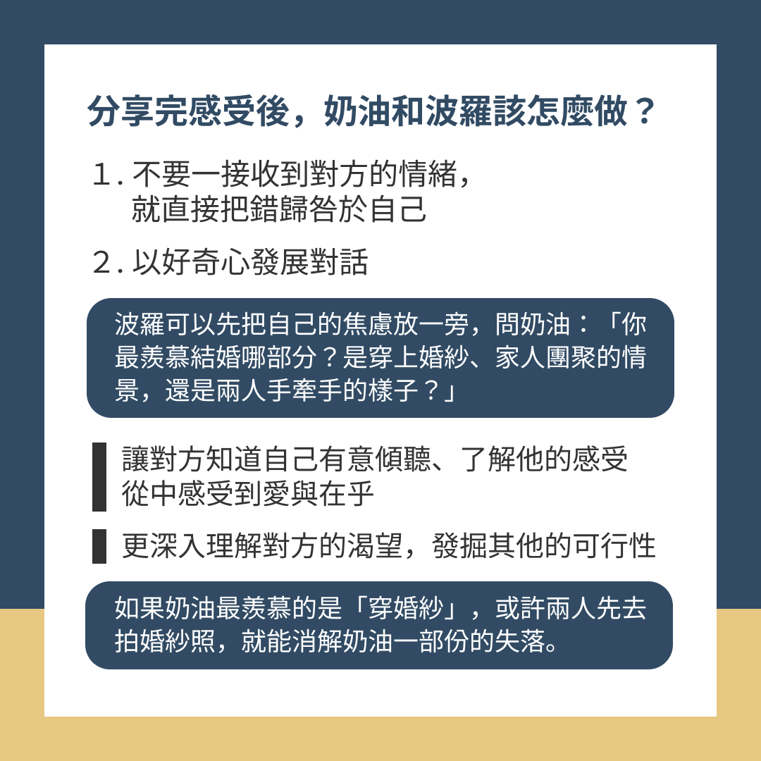 波羅可以先把自己的焦慮放一旁,問奶油:「你對於結婚最羨慕的是哪個部分?是穿上婚紗、家人團聚的情景,還是兩人手牽手的樣子?」