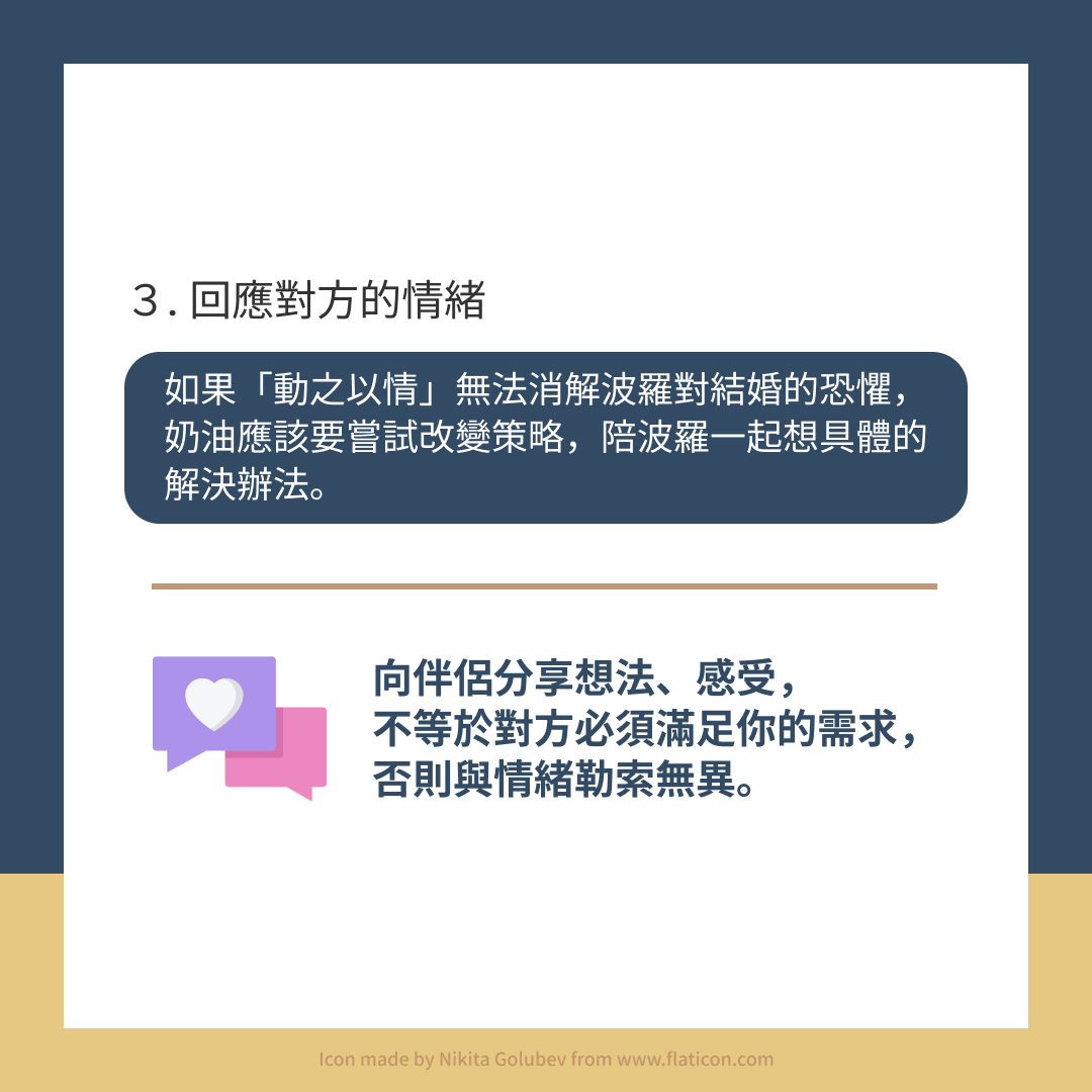 如果「動之以情」無法消解波羅對結婚的恐懼,奶油應該要嘗試改變策略,陪波羅一起想具體的解決辦法。